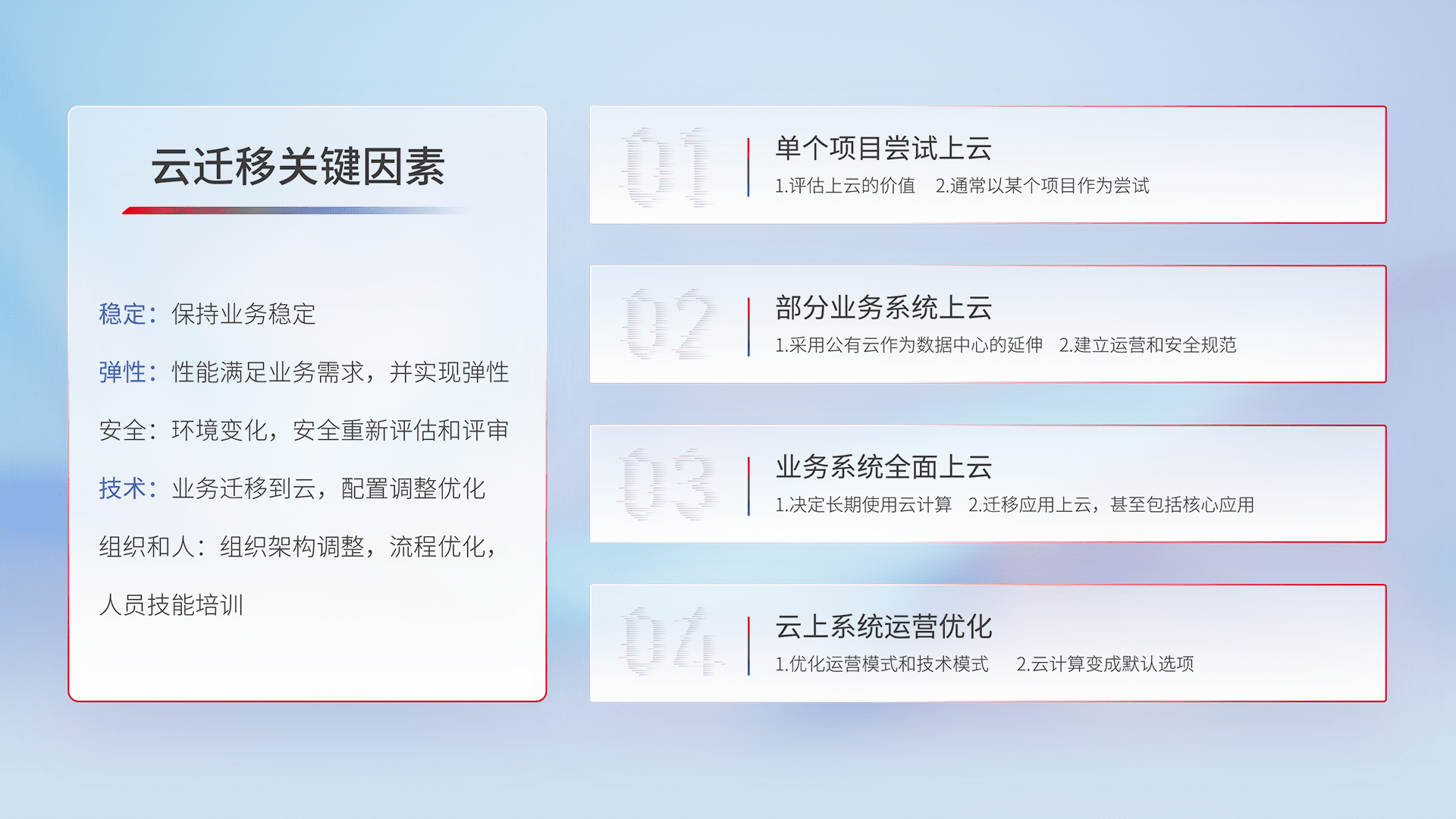 结合实际业务,,,从规划设计、、、、云平台选型、、云原生改造、、、、数据迁移、、、集成交付,,,迁移全过程为客户识别最佳上云路径,,做好风险识别管理,,,设计网络架构、、、、身份权限、、、安全审计合规、、操作审计、、、、日志审计、、、、监控告警策略、、、、多站点容灾设计等,,对云上基础设施进行整体规划,,,,提升IT治理水平,,,,以满足弹性、、高可用、、、、高性能的需求。。
