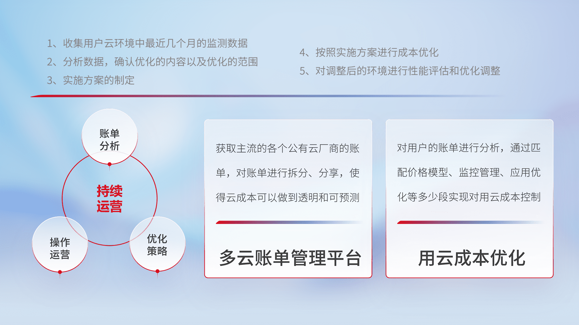 通过多云纳管,,,以统一的资源数据模型把客户的云资源进行抽象和封装,,,,进而实现对多云资源的统一操作,,,保障云资源管理的可靠性、、、稳定性与可用性。。。。量身定制化运维内容,,配置、、、开发运维、、补丁管理、、、备份、、监控、、、、认证和访问管理、、、审计和日常巡检等,,,,保障在用云过程中的可靠度,,,稳定度以及高可用率。。