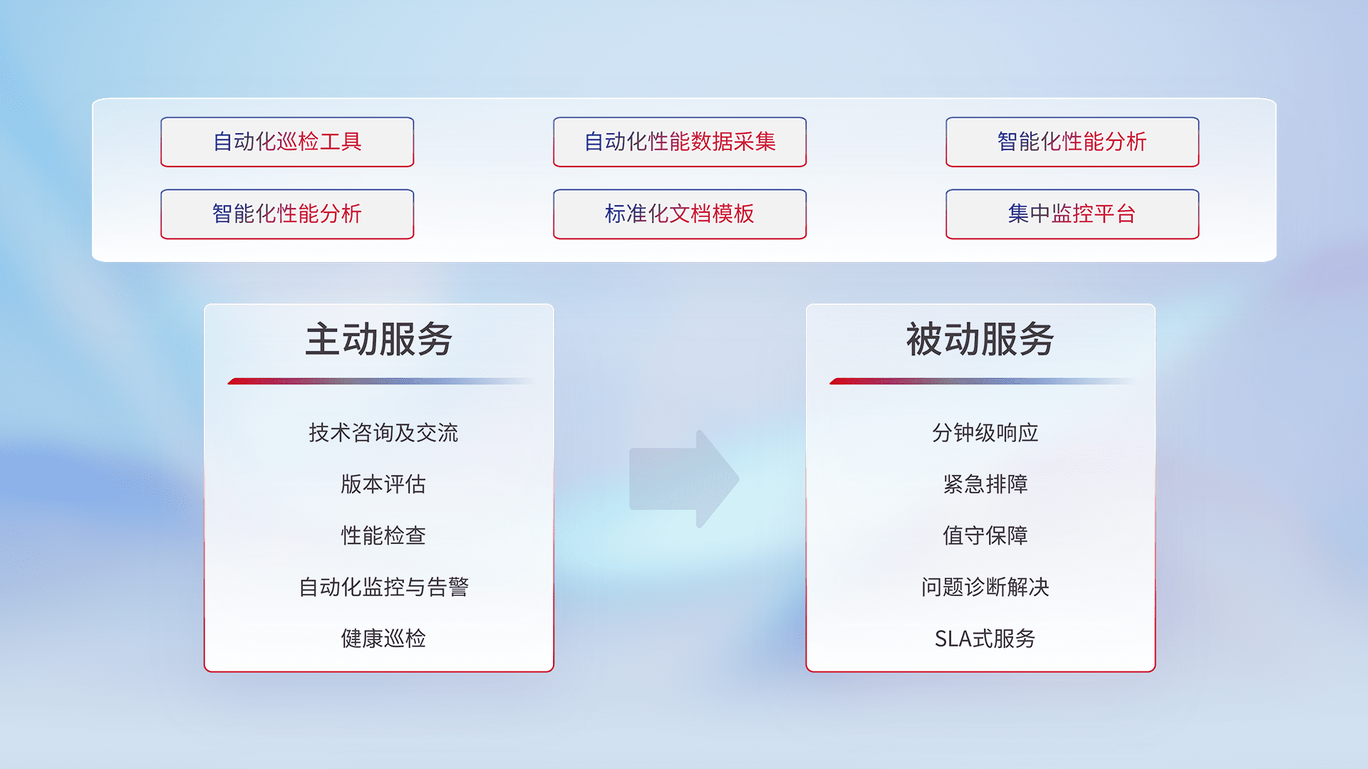 智能化工具和标准化文档,,,保障服务质量,,提供主动服务(包含技术咨询、、、、版本评估、、性能检查、、、自动化监控与告警、、、、健康巡检)和被动服务包含(分钟级响应、、、紧急排障、、值守保障、、、、问题诊断解决、、SLA服务)。。。。